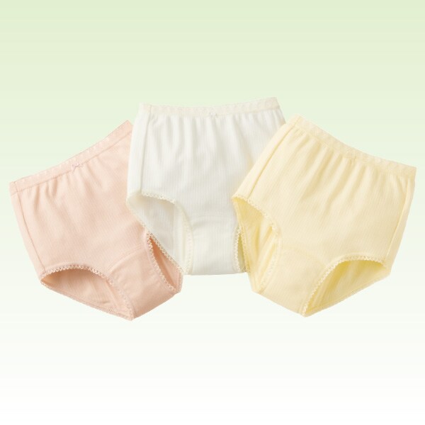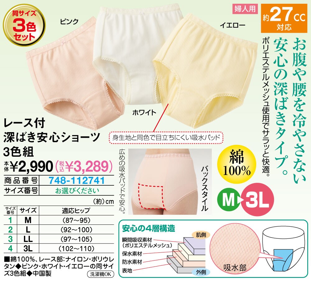 お腹や腰を冷やさない安心の深ばきタイプ! <旅行><外出><スポーツ>お出掛け先でも安心・快適 ポリエステルメッシュ使用でサラッと快適。 身生地と同色で目立ちにくい吸水パッド 広めの吸水パッドで安心。 【安心の4層構造】 瞬間吸収素材(ポリエステルメッシュ)/保水素材/防水素材/表地 ●綿100% ●同サイズ3色セット ●M~3L ●約27cc対応 ●婦人用