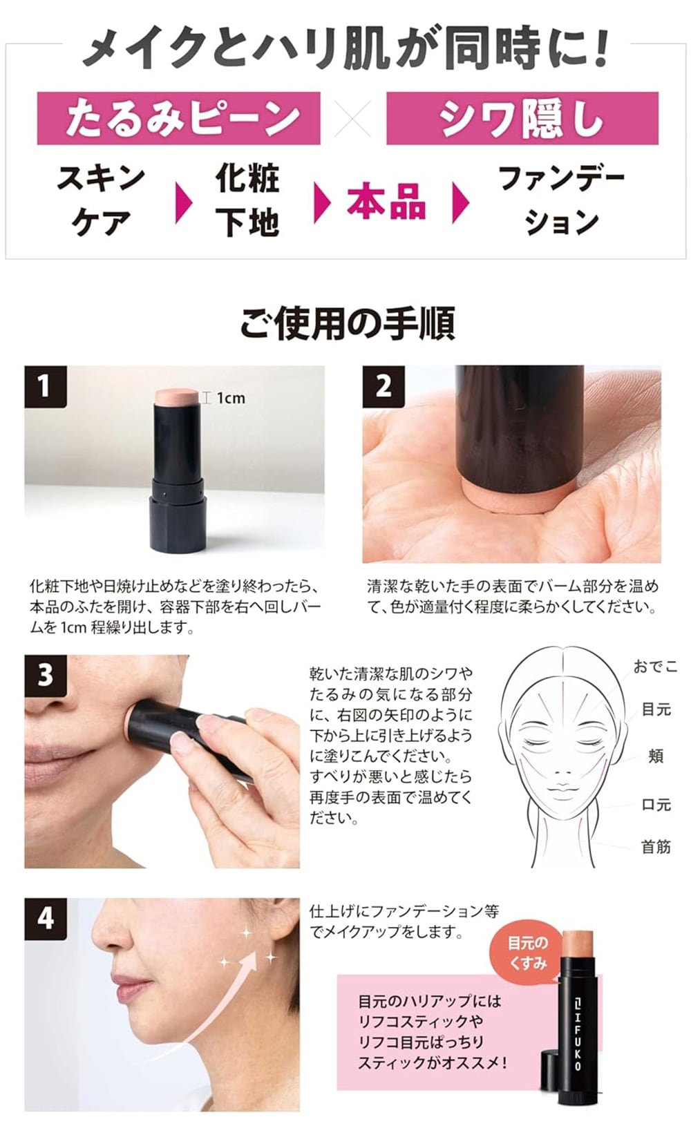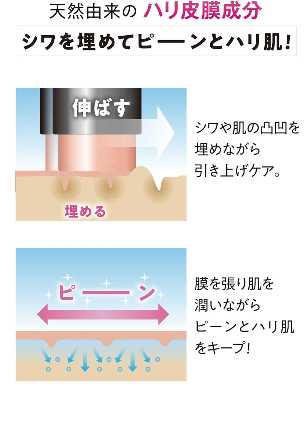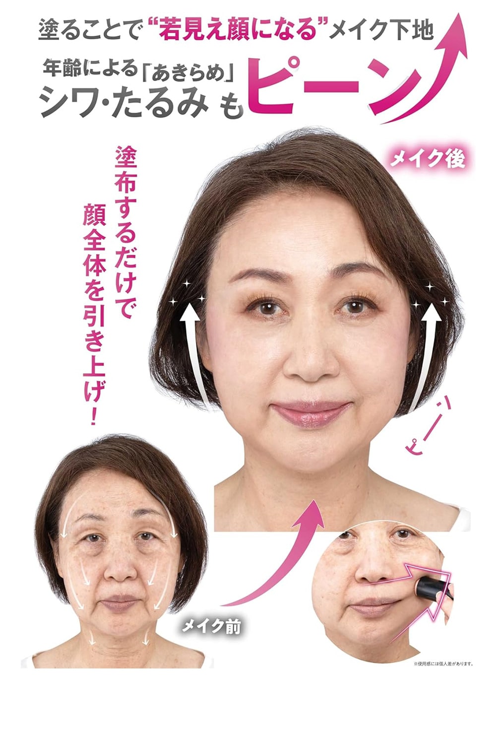 ◎塗ることで若見え顔になるメイク下地。年齢によるシワ・たるみもピーン! ◎独自のハリ皮膜成分で気になる小じわを埋めて、たるみを伸ばしながら引き上げ、肌をしっかり固定します。 ◎天然由来のハリ皮膜成分が、シワを埋めてピーンとハリ肌に!シワや肌の凹凸を埋めながら引き上げ、膜を張りつつも美容成分配合で潤いながらピーンとハリ肌をキープ! ◎4つのフリー処方:パラベン不使用・アルコール不使用・無香料・合成色素不使用