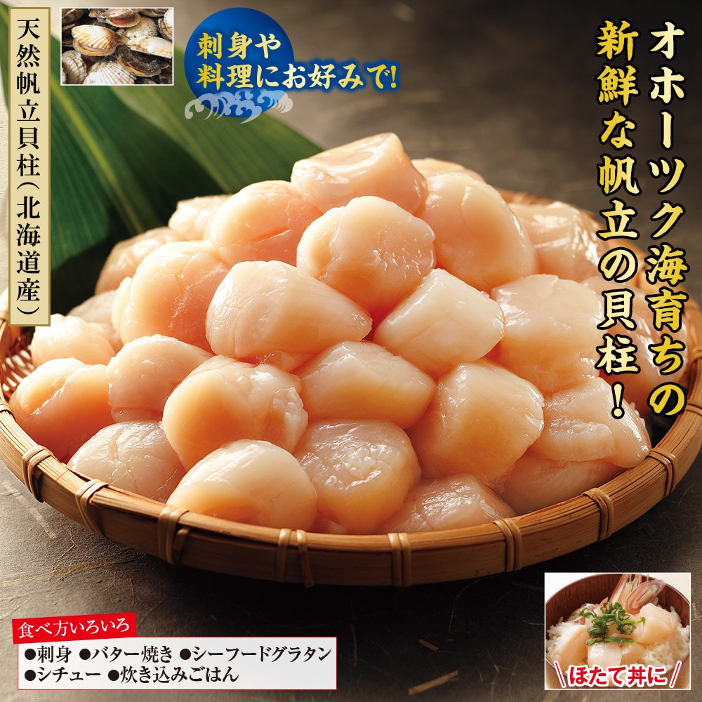 【天然帆立貝柱(北海道産)】 新鮮な生の帆立貝柱を急速冷凍。 強い甘みとコクは北海道産ならではです。 ボリューム満点でこのお値段は見逃せません。 刺身や料理にお好みで! 食べ方いろいろ ●刺身 ●バター焼き ●シーフードグラタン●シチュー ●炊き込みごはん
