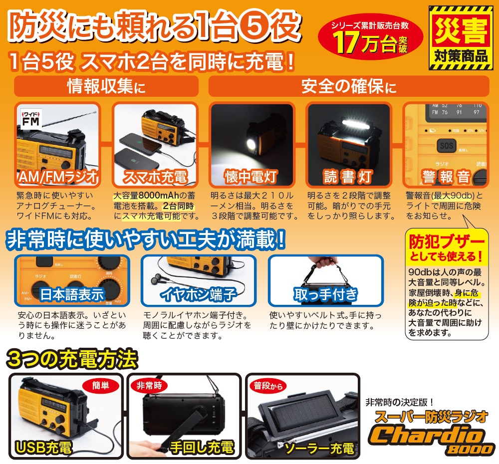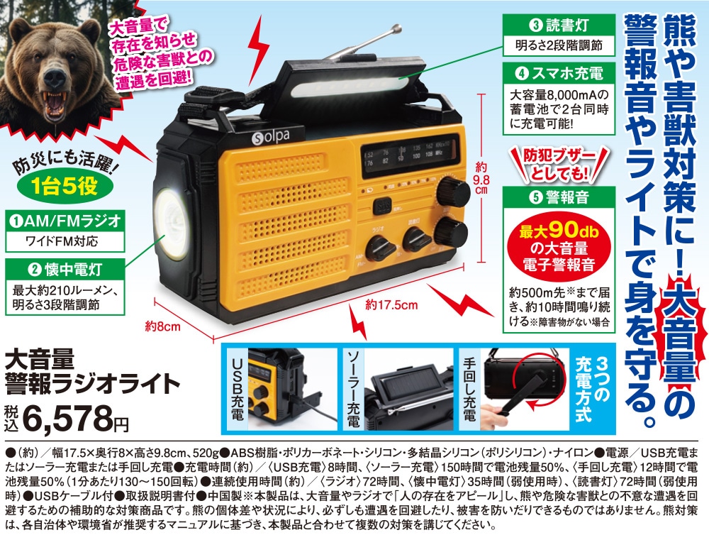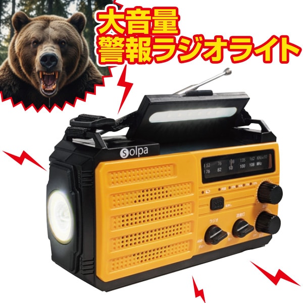 大音量で存在を知らせ、危険な害獣との遭遇を回避! 最大90dbの大音量電子警報音! 約500m先※まで届き、約10時間鳴り続ける。 (※障害物がない場合) 防災にも活躍! 【AM/FMラジオ】ワイドFM対応 【懐中電灯】最大約210ルーメン、明るさ3段階調節 【読書灯】明るさ2段階調節 【スマホ充電】大容量8,000mAhの蓄電池で2台同に充電可能 【3つの充電方式】手回し充電・ソーラー充電・USB充電 ◎防犯ブザーとしても