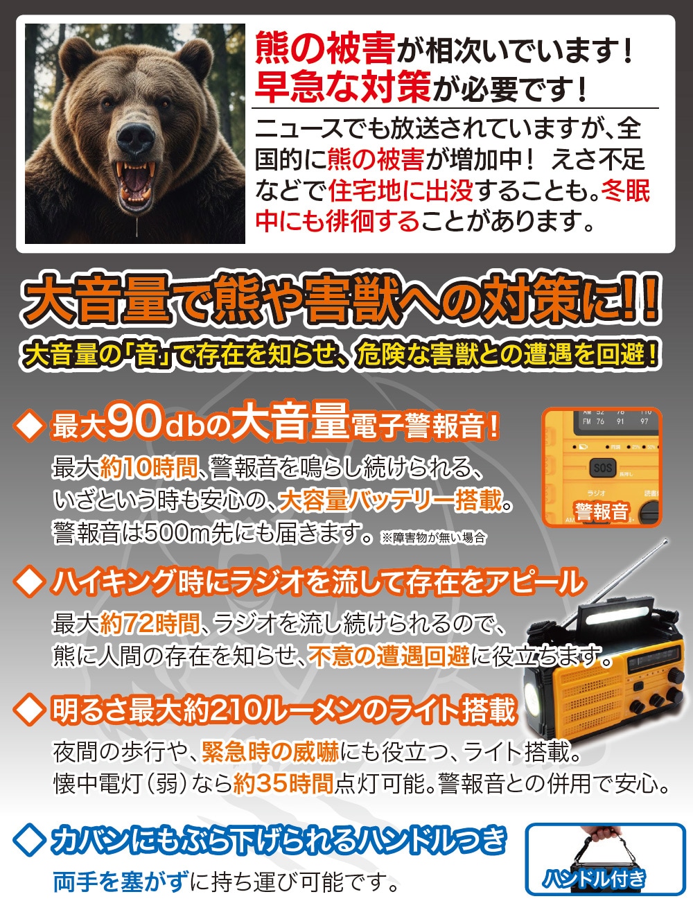 ※本製品は、大音量やラジオで「人の存在をアピール」し、熊や危険な害獣との不意な遭遇を回避するための補助的な対策商品です。熊の個体差や状況により、必ずしも遭遇を回避したり、被害を防いだりできるものではありません。熊対策は、各自治体や環境省が推奨するマニュアルに基づき、本製品と合わせて複数の対策を講じてください。