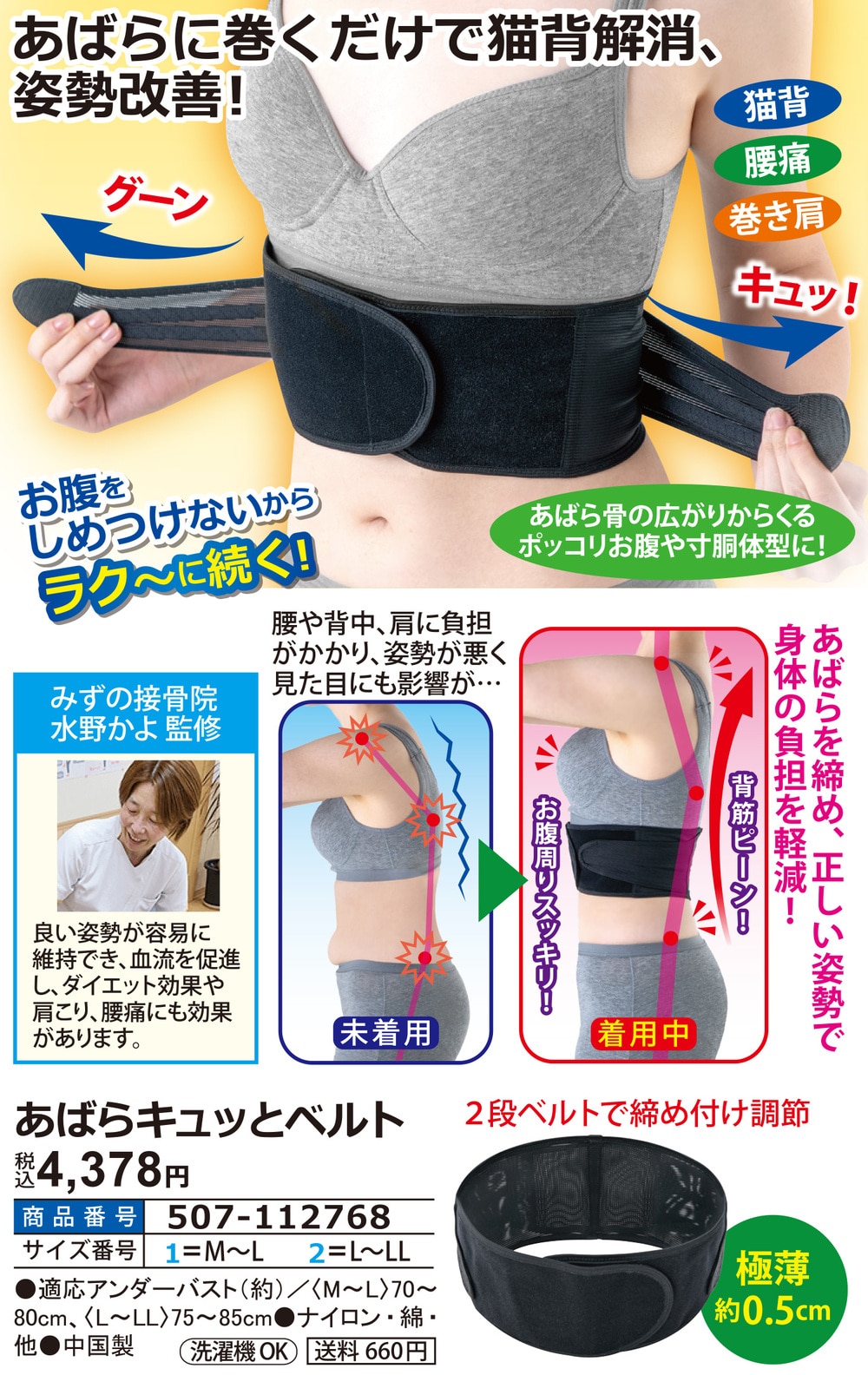 ●お腹をしめつけないからラク~に続く! ●猫背●腰痛●巻き肩 あばら骨の広がりからくるポッコリお腹や寸胴体型に! 腰や背中、肩に負担がかかり、姿勢が悪く見た目にも影響が・・・ →あばらを締め、正しい姿勢で身体の負担を軽減! ●2段ベルトで締め付け調節 ●極薄約0.5cm 【みずの接骨院水野かよ 監修】 良い姿勢が容易に維持でき、血流を促進し、ダイエット効果や肩こり、腰痛にも効果があります。