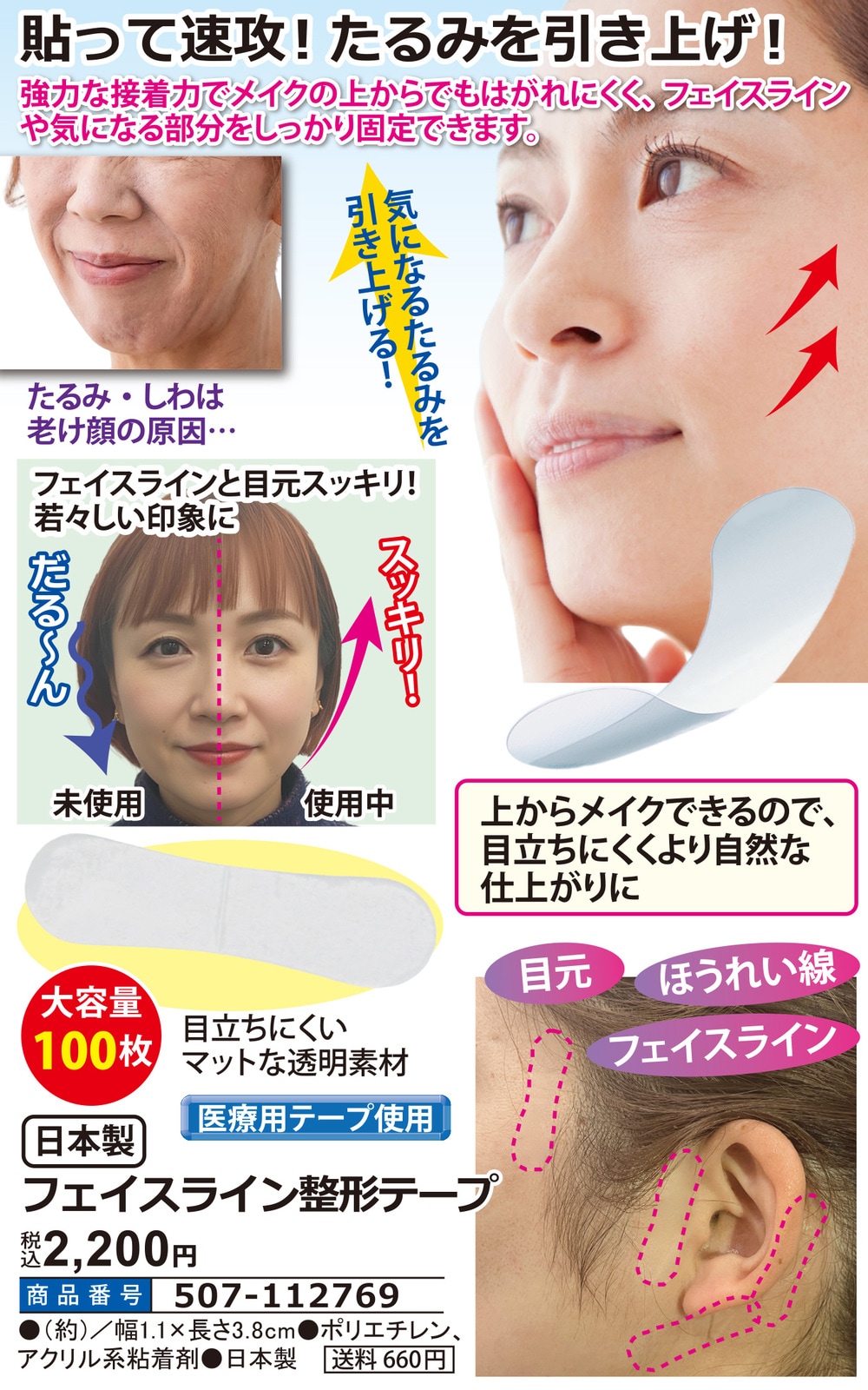 ●強力な接着力でメイクの上からでもはがれにくく、フェイスラインや気になる部分をしっかり固定できます。 ●気になるたるみを引き上げる! ●フェイスラインと目元スッキリ!若々しい印象に ●上からメイクできるので、目立ちにくくより自然な仕上がりに ●目立ちにくいマットな透明素材 ●目元●ほうれい線●フェイスライン ●医療用テープ使用 ●大容量100枚