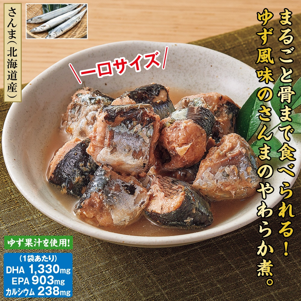 【さんま(北海道産)】 まるごと骨まで食べられる!ゆず風味のさんまのやわらか煮。 一口サイズ。ゆず果汁を使用! 1袋あたり DHA 1,330mg EPA 903mg カルシウム 238mg