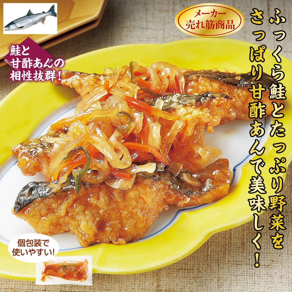 メーカー売れ筋商品 鮭と甘酢あんの相性抜群! 鮭を衣で揚げて玉ねぎ、人参、ピーマンと一緒に甘酢あんでからめました。 魚料理のバリエーションにいかがですか? 個包装で使いやすい!