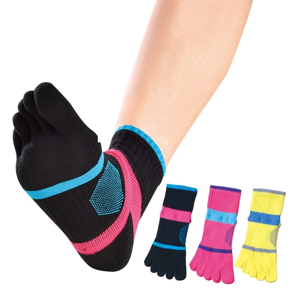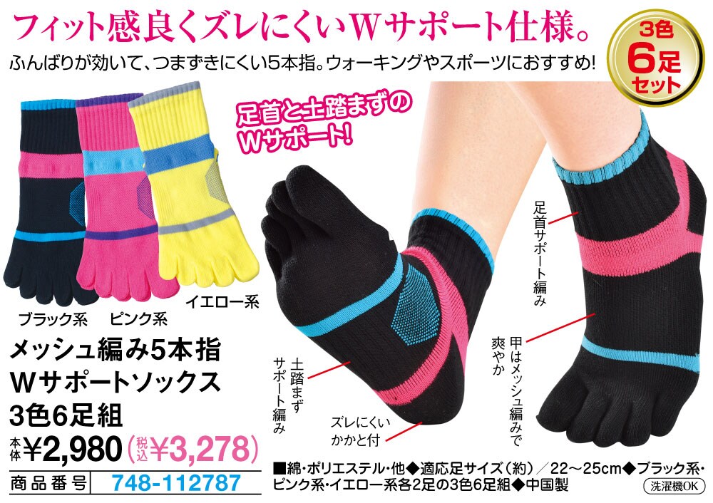 フィット感良くズレにくいWサポート仕様! ふんばりが効いて、つまずきにくい5本指。 ウォーキングやスポーツにおすすめ! ●足首と土踏まずのWサポート! ●足首サポート編み ●甲はメッシュ編みで爽やか ●土踏まずサポート編み ●ズレにくいかかと付 ●3色6足