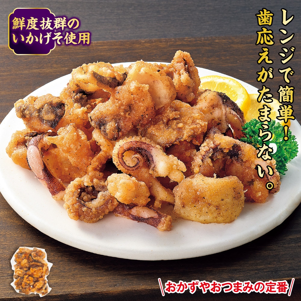 鮮度抜群のいかげそを唐揚げにしました。 しっかりとした味付けが自慢の商品です。 おかずやおつまみの定番。
