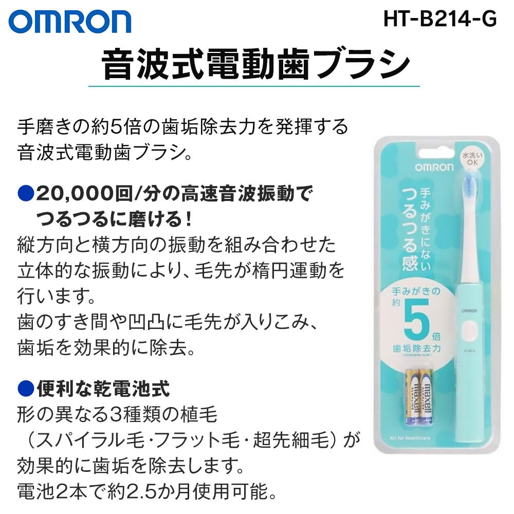 【質量】約60g(ブラシ・乾電池含む) 【寸法】幅21.8×高さ167×奥行き21.8mm(高さにブラシは含みません) 【電源】単4形アルカリ乾電池×2個 【振動数】約20000回/分 【付属品】歯垢除去ブラシ(SB-172)×1本、お試し用電池×2本、取扱説明書