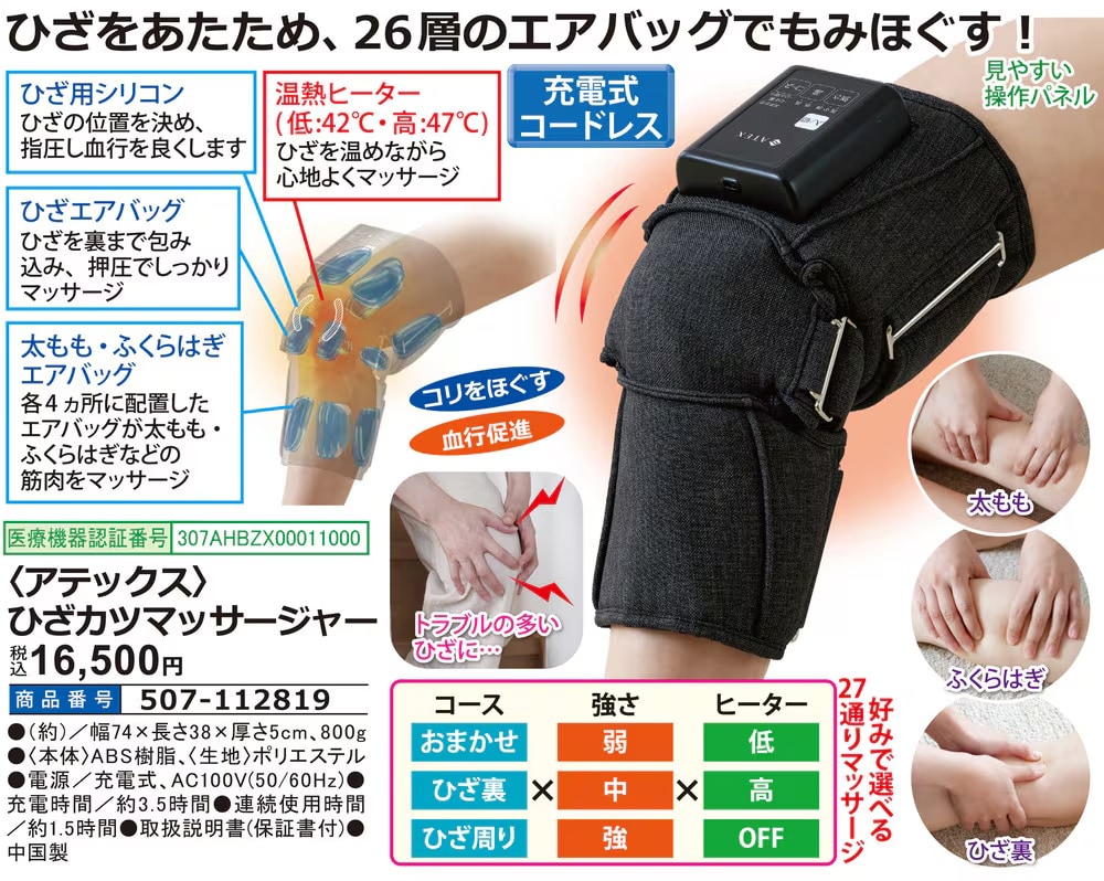 【ひざ用シリコン】 ひざの位置を決め、指圧し血行を良くします 【ひざエアバッグ】 ひざを裏まで包み込み、押圧でしっかりマッサージ 【太もも・ふくらはぎエアバッグ】 各4ヵ所に配置したエアバッグが太もも・ふくらはぎなどの筋肉をマッサージ 【温熱ヒーター(低:42度・高:47度)】 ひざを温めながら心地よくマッサージ ●充電式コードレス ●コリをほぐす ●血行促進 ●見やすい操作パネル 医療機器認証番号:307AHBZX00011000