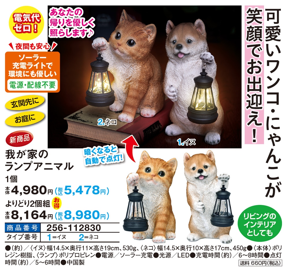 ●(約)/<イヌ>幅14.5×奥行11×高さ19cm、530g、<ネコ>幅14.5×奥行10×高さ17cm、450g ●<本体>ポリレジン樹脂、<ランプ>ポリプロピレン ●電源/ソーラー充電 ●光源/LED ●充電時間(約)/6~8時間 ●点灯時間(約)/5~6時間 ●中国製