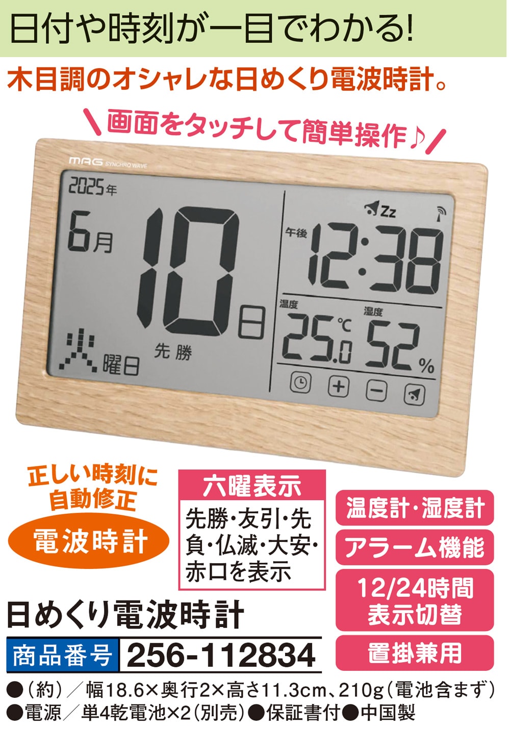 日付や時刻が一目でわかる! 木目調のオシャレな日めくり電波時計! 画面をタッチして簡単操作♪ 正しい時刻に自動修正 電波時計 【六曜表示】 先勝・友引・先負・仏滅・大安・赤口を表示 ●温度計・湿度計 ●アラーム機能 ●12/24時間表示切替 ●置掛兼用