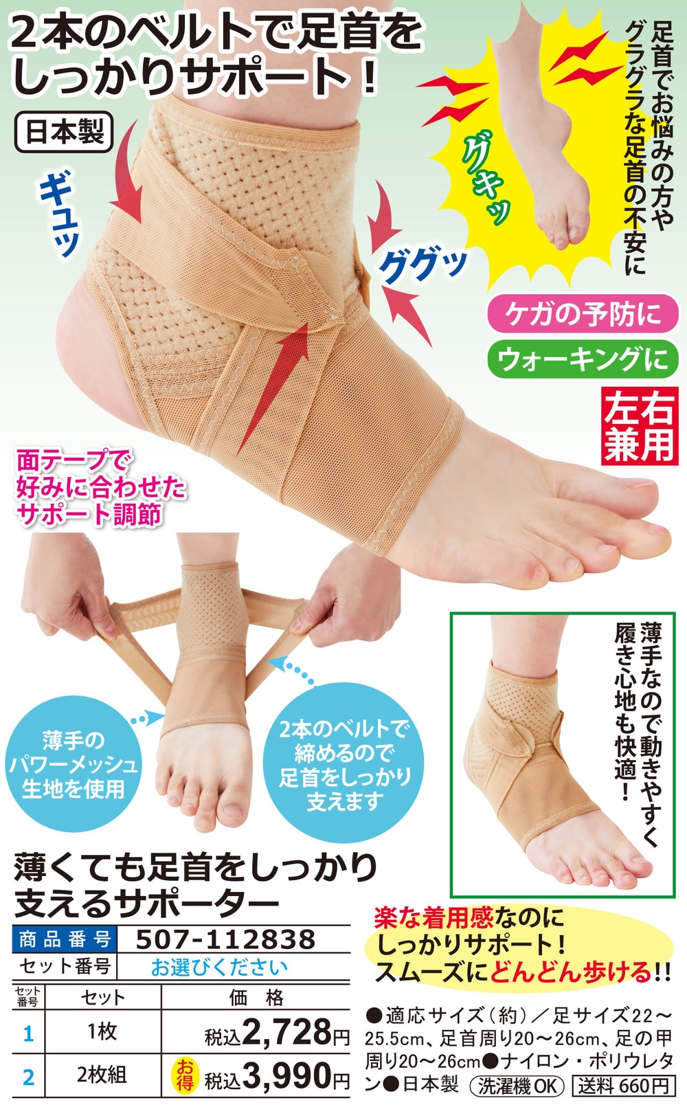 ●足首でお悩みの方やグラグラな足首の不安に ●面テープで好みに合わせたサポート調節 ●薄手のパワーメッシュ生地を使用 ●2本のベルトで締めるので足首をしっかり支えます ●薄手なので動きやすく履き心地も快適! ●楽な着用感なのにしっかりサポート!スムーズにどんどん歩ける!! ●ケガの予防に ●ウォーキングに ●左右兼用