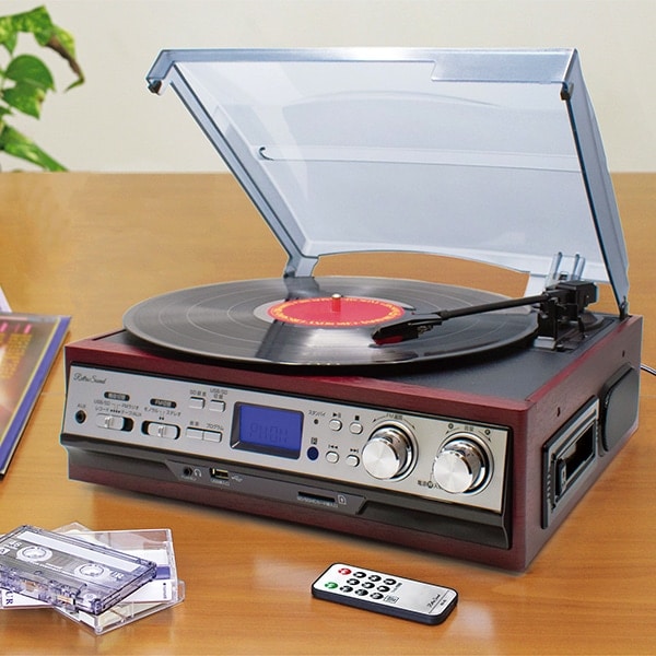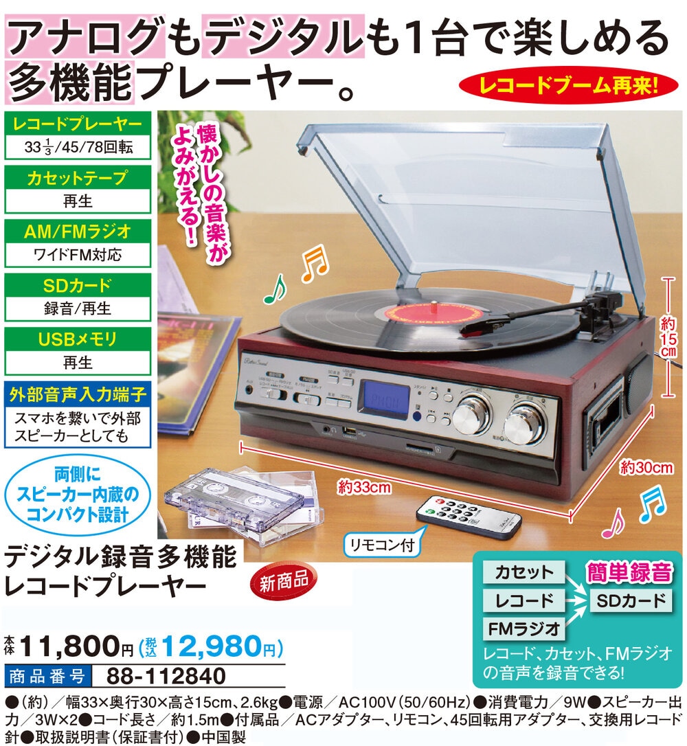 アナログもデジタルも1台で楽しめる多機能プレーヤー! レコードブーム再来! 懐かしの音楽がよみがえる! 両側にスピーカー内蔵のコンパクト設計 リモコン付 \簡単録音/ レコード、カセット、FMラジオの音声を録音できる! ●レコードプレーヤー:33 1/3・45・78回転 ●カセットテープ:再生 ●AM/FMラジオ:ワイドFM対応 ●SDカード:録音/再生 ●USBメモリ:再生 ●外部音声入力端子:スマホを繋いで外部スピーカーとしても