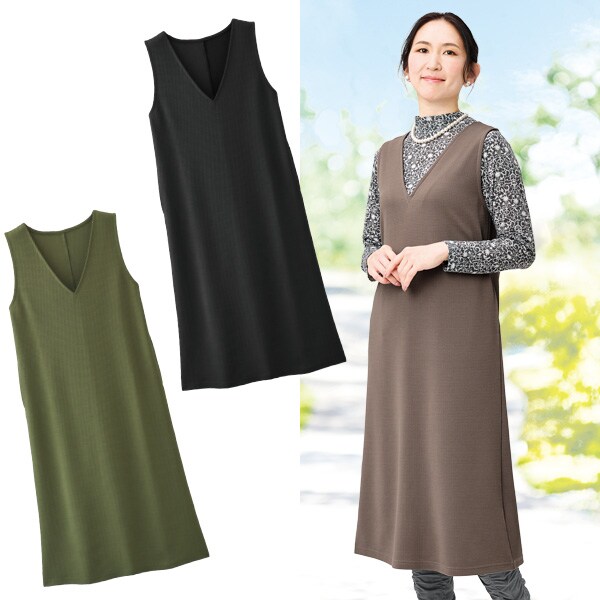胸元をすっきり見せる深めのVネック。Aラインシルエットでさり気なく体型をカバーし、インナー次第で一年中着回せます。