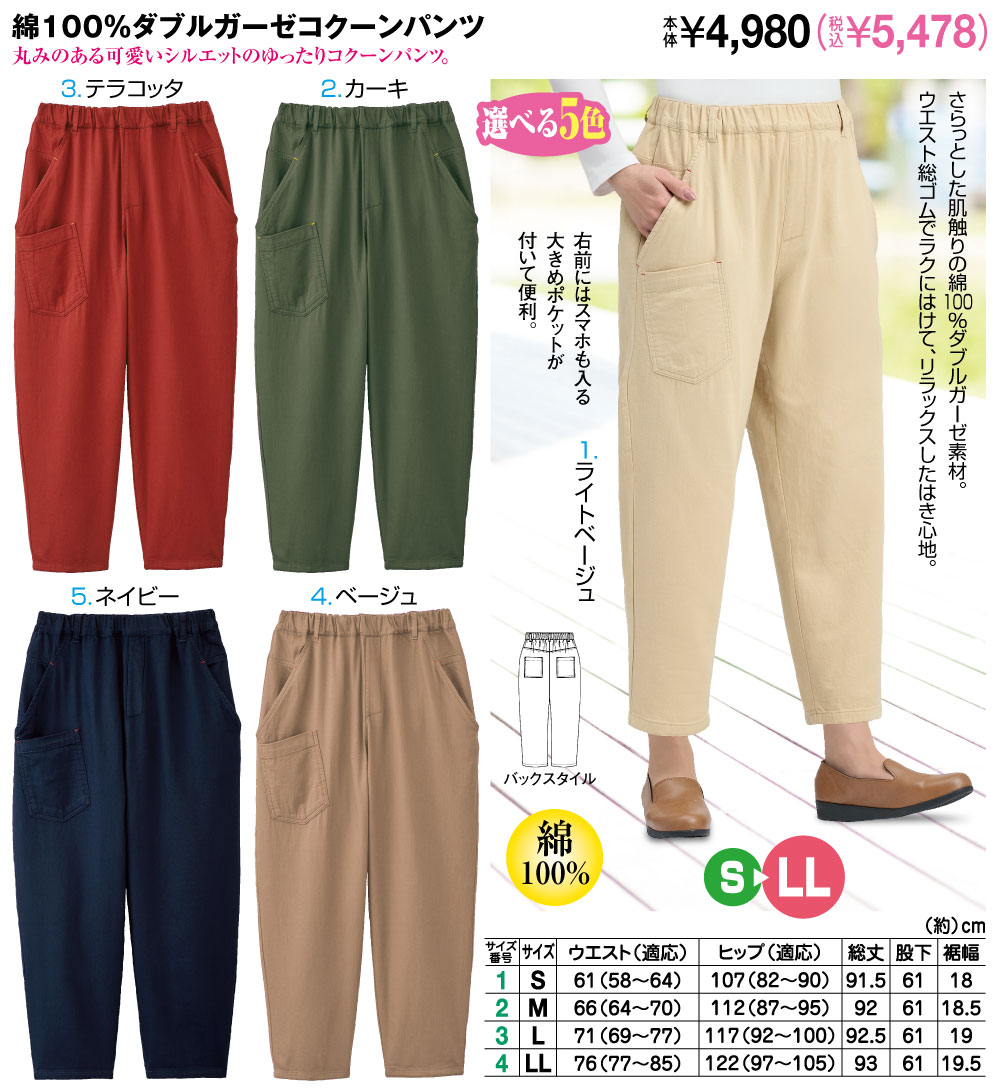 ◆ウエスト総ゴム、両側ポケット付、右前ポケット付、後左右ポケット付、ベルト通し付