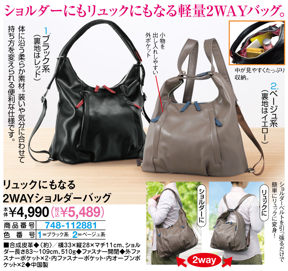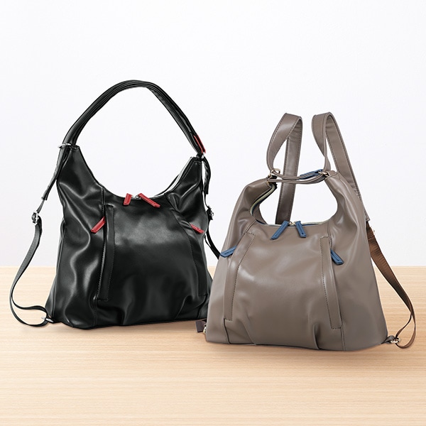 ショルダーにもリュックにもなる軽量2WAYバッグ! 体に沿う柔らか素材。装いや気分に合わせて持ち方を変えられる便利な仕様です。 ショルダーベルトを引っ張るだけで簡単にリュックに変身! 小物を出し入れしやすい外ポケット 中が見やすくたっぷり収納。 ●2way