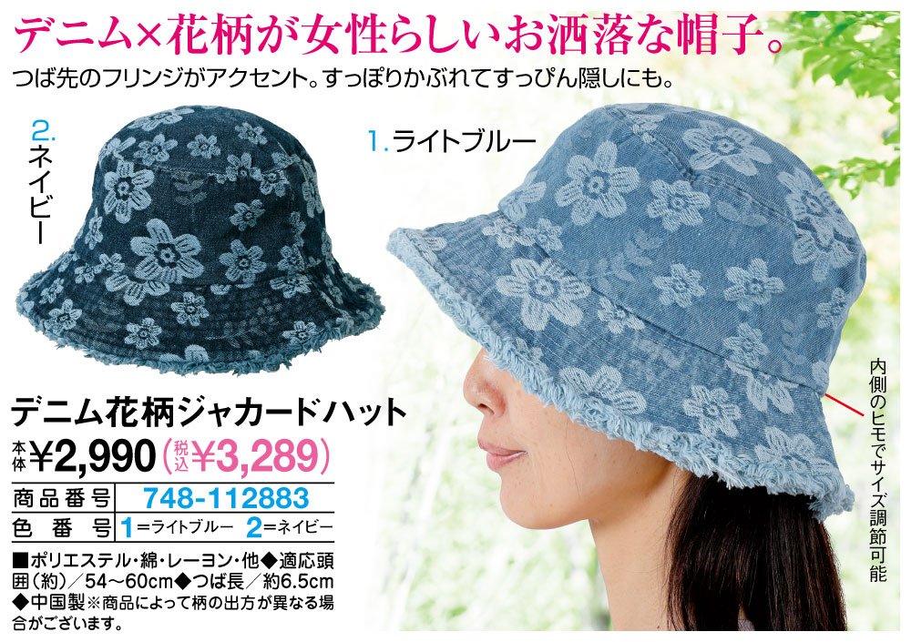 デニム×花柄が女性らしいお洒落な帽子! つば先のフリンジがアクセント。すっぽりかぶれてすっぴん隠しにも。 内側のヒモでサイズ調節可能