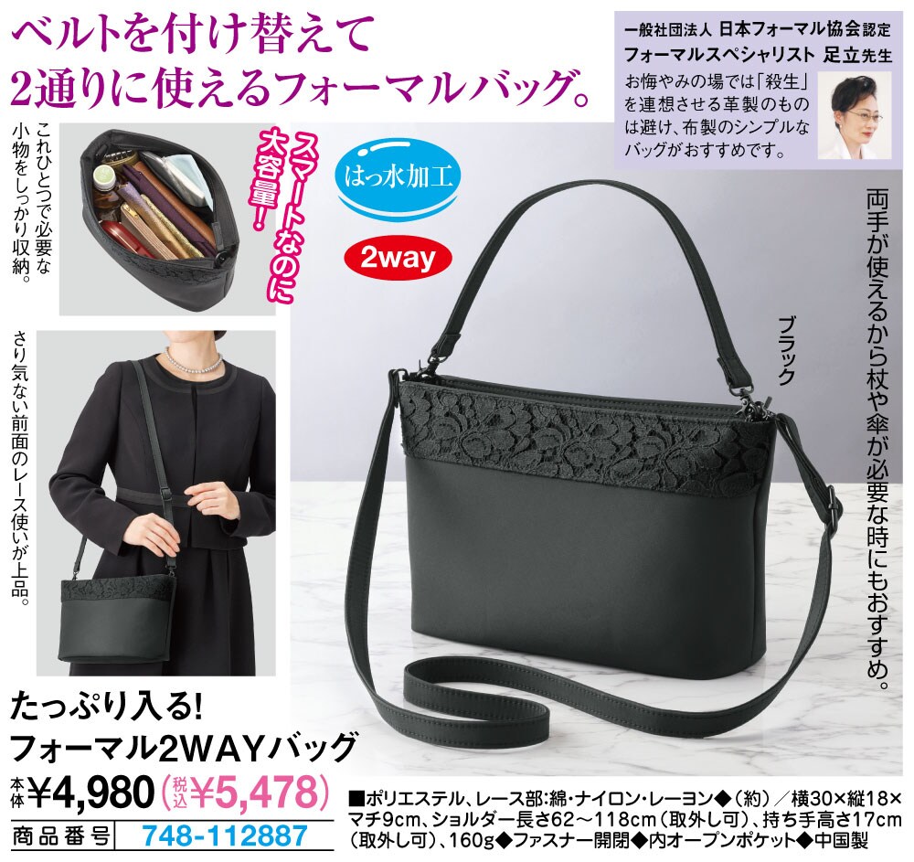 ベルトを付け替えて2通りに使えるフォーマルバッグ! 両手が使えるから杖や傘が必要な時にもおすすめ。 【一般社団法人 日本フォーマル協会認定 フォーマルスペシャリスト 足立先生】 お悔やみの場では「殺生」を連想させる革製のものは避け、布製のシンプルなバッグがおすすめです。 スマートなのに大容量! これひとつで必要な小物をしっかり収納。 さり気ない前面のレース使いが上品。 ●2way ●はっ水加工