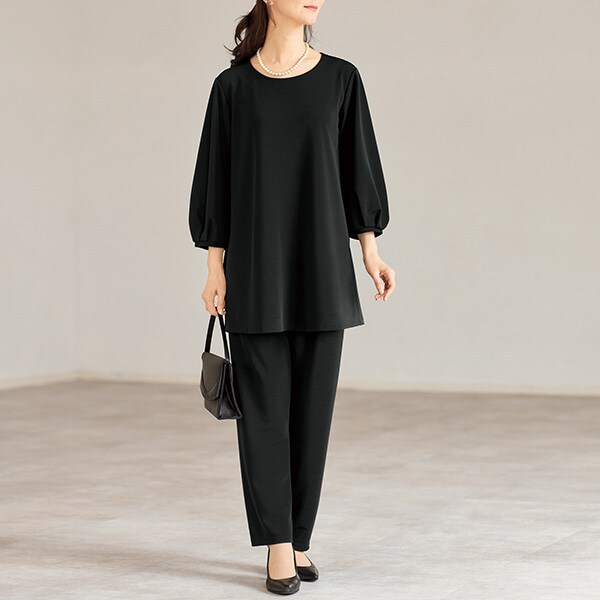 落ち感が綺麗で上質なさらさら機能性素材のフォーマルパンツセット! パフスリーブで手首ほっそり見えの長め丈Aラインチュニックにゆったりとした腰周りでらくちんなパンツをセットアップ。 シワになりにくく、洗濯機で洗えてお手入れも簡単です。 ウエスト総ゴムでラクラク! ストレッチ素材で立ち座りや曲げ伸ばしもラクラク! 【テイジン「ウェーブロン」】 四つ山偏平状の断面をもつ機能性繊維。透けにくい素材で吸汗・速乾性にも優れ、汗による冷えやムレを軽減します。 ●吸汗 速乾 ●防シワ加工 ●UVカット率99%以上 ●M~3L