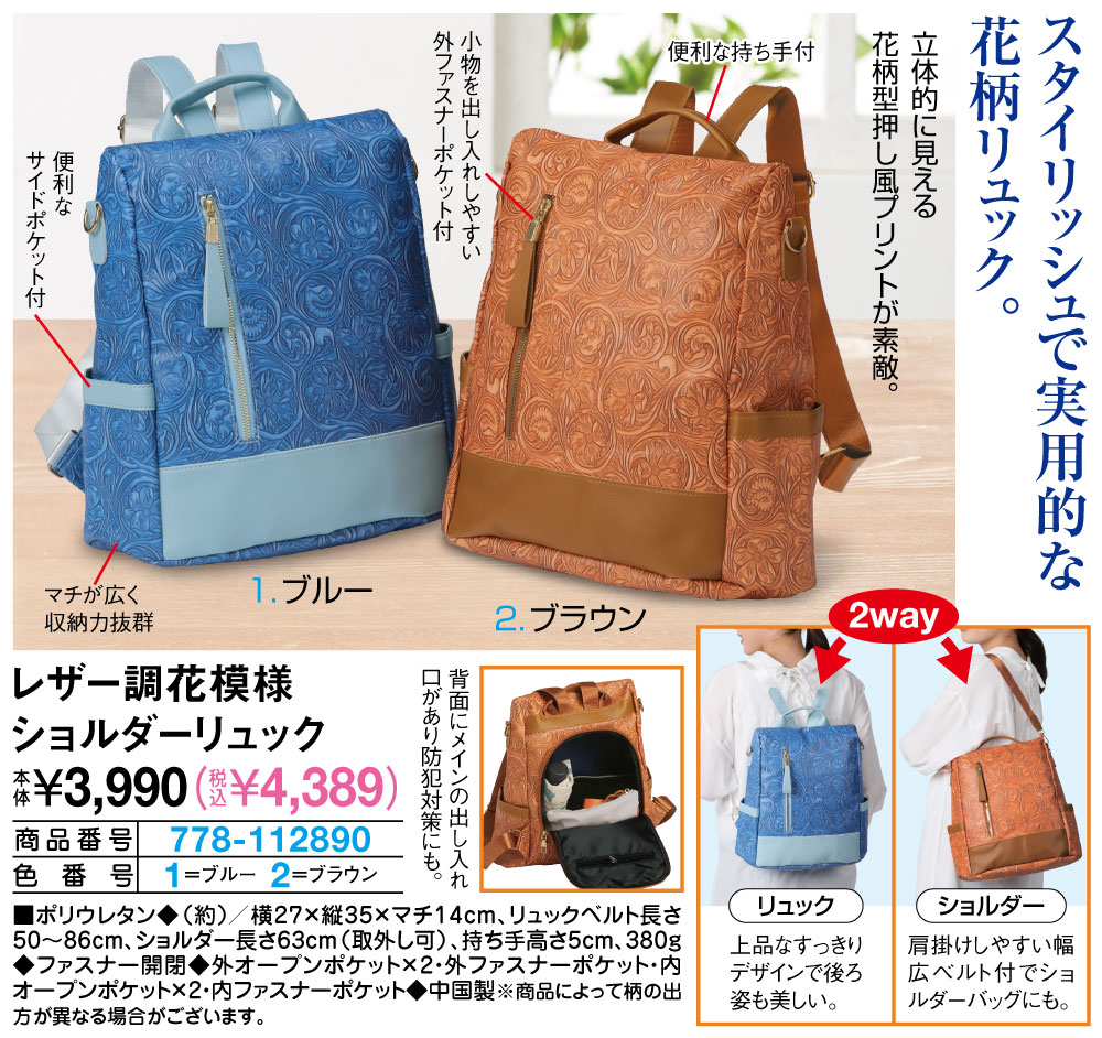 スタイリッシュで実用的な花柄リュック! 立体的に見える花柄型押し風プリントが素敵。 【2way】 リュック 上品なすっきりデザインで後ろ姿も美しい。 ショルダー 肩掛けしやすい幅広ベルト付でショルダーバッグにも。 便利なサイドポケット付 マチが広く収納力抜群 小物を出し入れしやすい外ファスナーポケット付 便利な持ち手付 背面にメインの出し入れ口があり防犯対策にも。