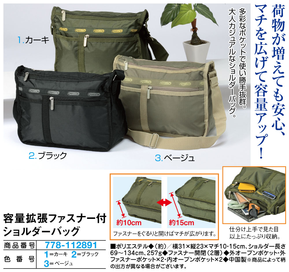 荷物が増えても安心、マチを広げて容量アップ! 多彩なポケットで使い勝手抜群。大人カジュアルなショルダーバッグ。 仕分け上手で見た目以上にたっぷり収納。 ファスナーをぐるりと開けばマチが広がります。