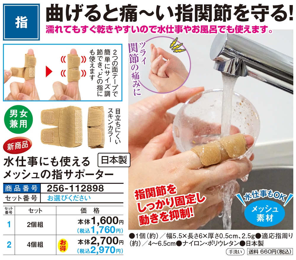 曲げると痛~い指関節を守る! 【理学療法士監修】 家事を頑張る手指をいたわるサポーター <監修>理学療法士 日本スポーツ協会公認 アスレティックトレーナー 廣岡敬三 先生 濡れてもすぐ乾きやすいので水仕事やお風呂でも使えます。 \ツライ関節の痛みに/ 指関節をしっかり固定し動きを抑制! 2つの面テープで簡単にサイズ調節でき、どの指にも使えます。 目立ちにくいスキンカラー。 \水仕事もOK/ メッシュ素材 ●男女兼用