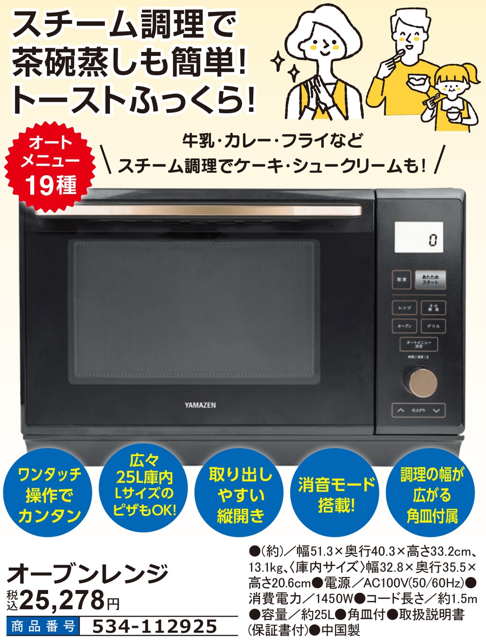 ●(約)/幅51.3×奥行40.3×高さ33.2cm、13.1kg、<庫内サイズ>幅32.8×奥行35.5×高さ20.6cm ●電源/AC100V(50/60Hz) ●消費電力/1450W ●コード長さ/約1.5m ●容量/約25L ●角皿付 ●取扱説明書(保証書付) ●中国製