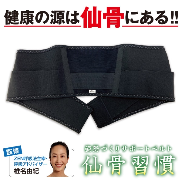 【仙骨を立てる姿勢がもたらす5つの効果】 1.腰や肩の負担を減らす 2.呼隠が深まり、自律神縫が調う 3.お腹が引き締まり、痩せやすい体に 4.内蔵の働きをサポート 5.心が落ち着き、前向きな気持ちに ●調節しやすい面テープ ●下部のゴムにより臀部を下から上げて仙骨を立ち上げます ZEN呼吸法主宰・呼吸アドバイザー 椎名由紀 監修