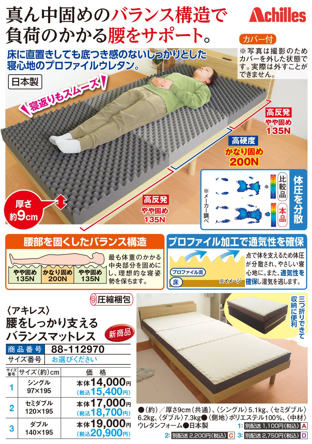 真ん中固めのバランス構造で負荷のかかる腰をサポート! 床に直置きしても底つき感のないしっかりとした寝心地のプロファイルウレタン。 \寝返りもスムーズ!/ 体圧を分散 【腰部を固くしたバランス構造】 最も体重のかかる中央部分を固めにし、理想的な寝姿勢を保ちます。 高反発やや固め135N 高硬度かなり固め200N 高反発やや固め135N 【プロファイル加工で通気性を確保】 点で体を支えるため体圧が分散され、やさしい寝心地に。 また、通気性を確保し湿気を逃します。 三つ折りできて収納に便利 カバー付 ●厚さ約9cm ●圧縮梱包