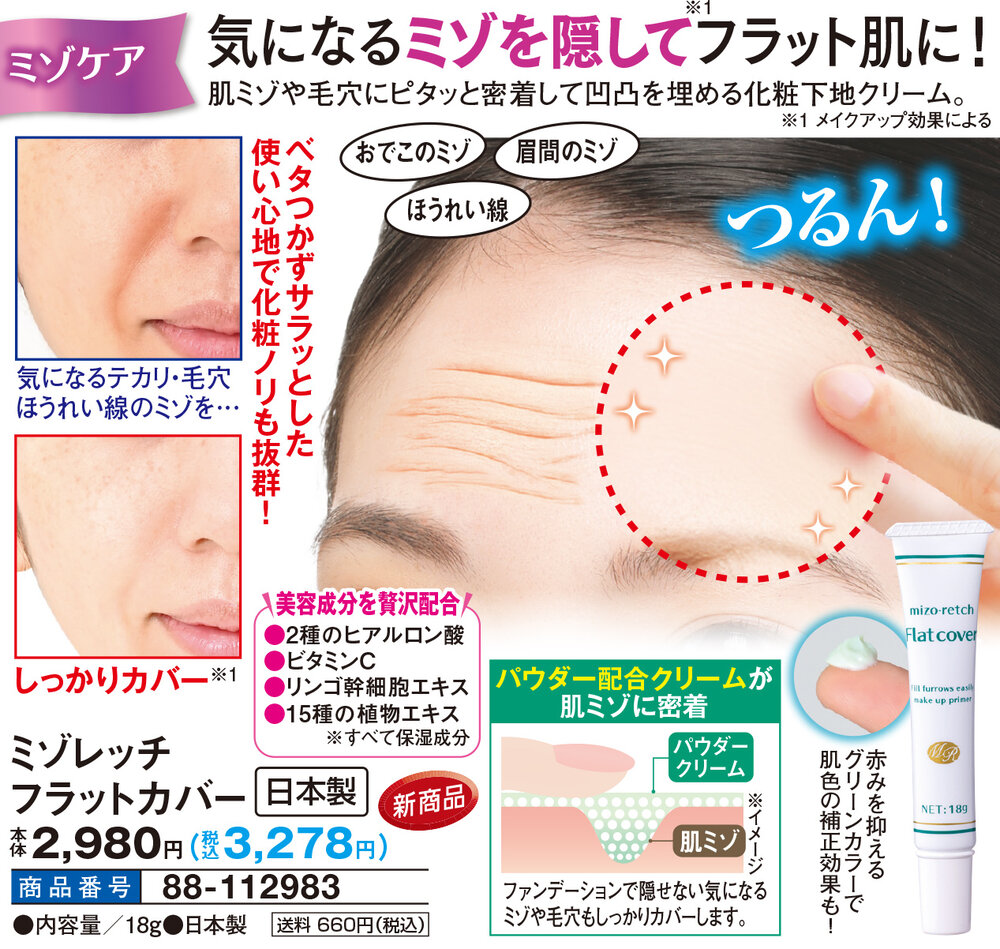 気になるミゾ(※1)を隠してフラット肌に! ミゾケア 肌ミゾや毛穴にピタッと密着して凹凸を埋める化粧下地クリーム。 ベタつかずサラッとした使い心地で化粧ノリも抜群! 気になるテカリ・毛穴ほうれい線のミゾを…しっかりカバー(※1) おでこのミゾ、眉間のミゾ、ほうれい線 つるん! 赤みを抑えるグリーンカラーで肌色の補正効果も! 【パウダー配合クリームが肌ミゾに密着】 ファンデーションで隠せない気になるミゾや毛穴もしっかりカバーします。 \美容成分を贅沢配合/ ●2種のヒアルロン酸 ●ビタミンC ●リンゴ幹細胞エキス ●15種の植物エキス ※すべて保湿成分