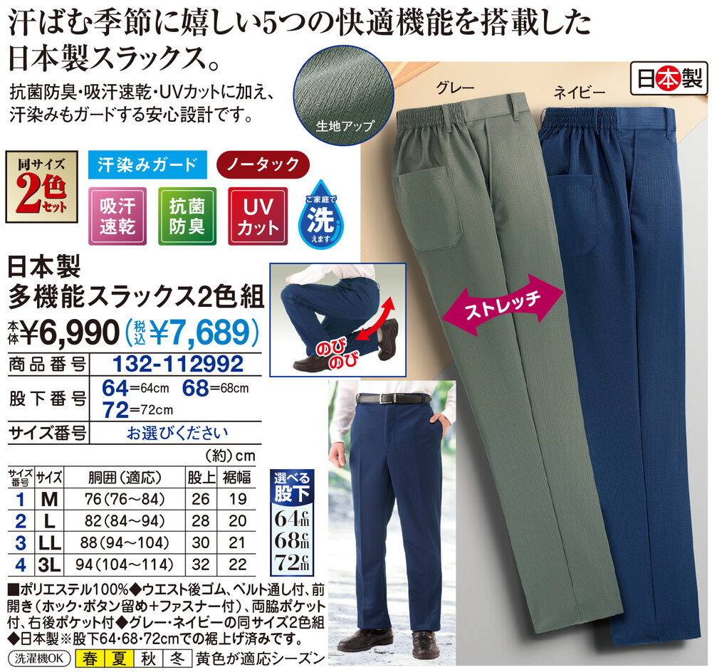 汗ばむ季節に嬉しい5つの快適機能を搭載した日本製スラックス! 抗菌防臭・吸汗速乾・UVカットに加え、汗染みもガードする安心設計です。 ●汗染みガード ●ストレッチ ●ノータック ●吸汗速乾 ●抗菌防臭 ●UVカット ●同サイズ2色セット