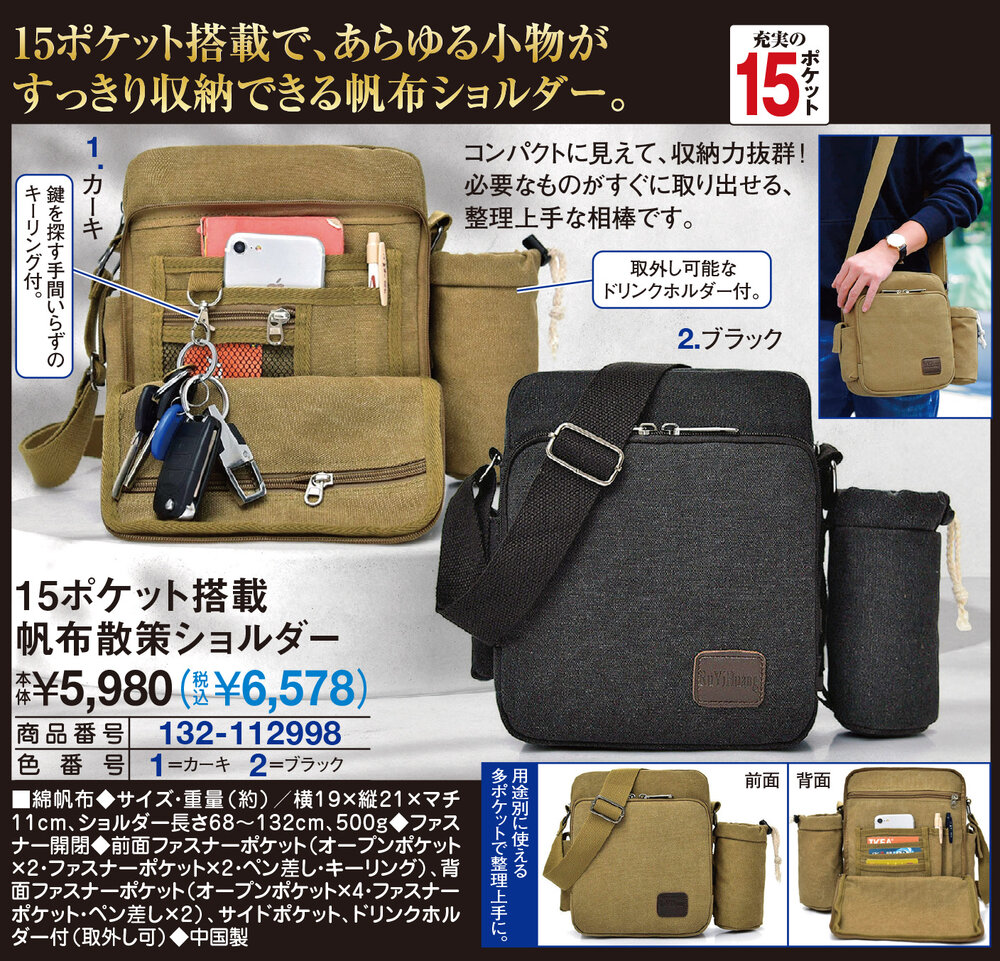 15ポケット搭載で、あらゆる小物がすっきり収納できる帆布ショルダー!