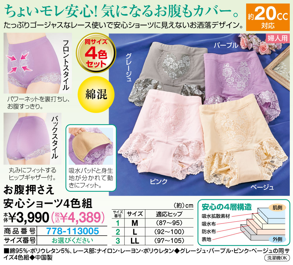 ちょいモレ安心!気になるお腹もカバー! たっぷりゴージャスなレース使いで安心ショーツに見えないお洒落デザイン。 パワーネットを裏打ちし、お腹すっきり。 丸みにフィットするヒップギャザー付。 吸水パッドと身生地が分かれて動きにフィット。 お出掛け先でも安心・快適 安心の4層構造 ●婦人用 ●綿混 ●約20cc対応 ●同サイズ4色セット ●旅行 ●外出 ●スポーツ