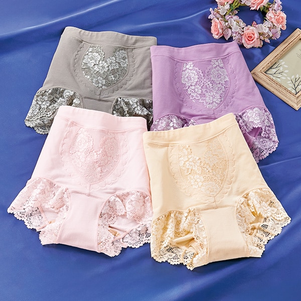 【サイズ(約)】 適応ヒップ <M>(87~95)cm <L>(92~100)cm <LL>(97~105)cm ■綿95%・ポリウレタン5%、レース部:ナイロン・レーヨン・ポリウレタン ◆グレージュ・パープル・ピンク・ベージュの同サイズ4色組 ◆中国製