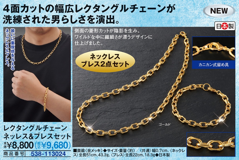4面カットの幅広レクタングルチェーンが洗練された男らしさを演出。 側面の菱形カットが陰影を生み、ワイルドな中に繊細さが漂うデザインに仕上げました。 装いに重厚感を与えるネックレス&ブレス。 カニカン式留め具