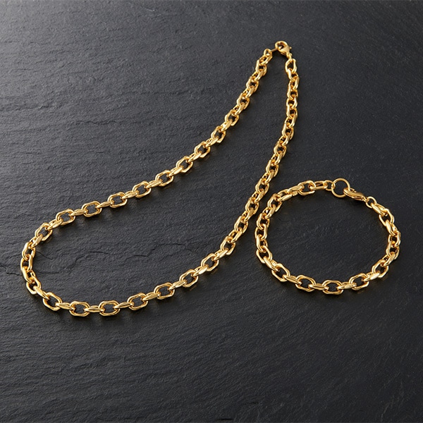 ■真鍮(金メッキ) ◆サイズ・重量(約)/<共通>幅0.7cm、<ネックレス>全長51cm、43.3g、<ブレス>全長22cm、18.3g ◆日本製