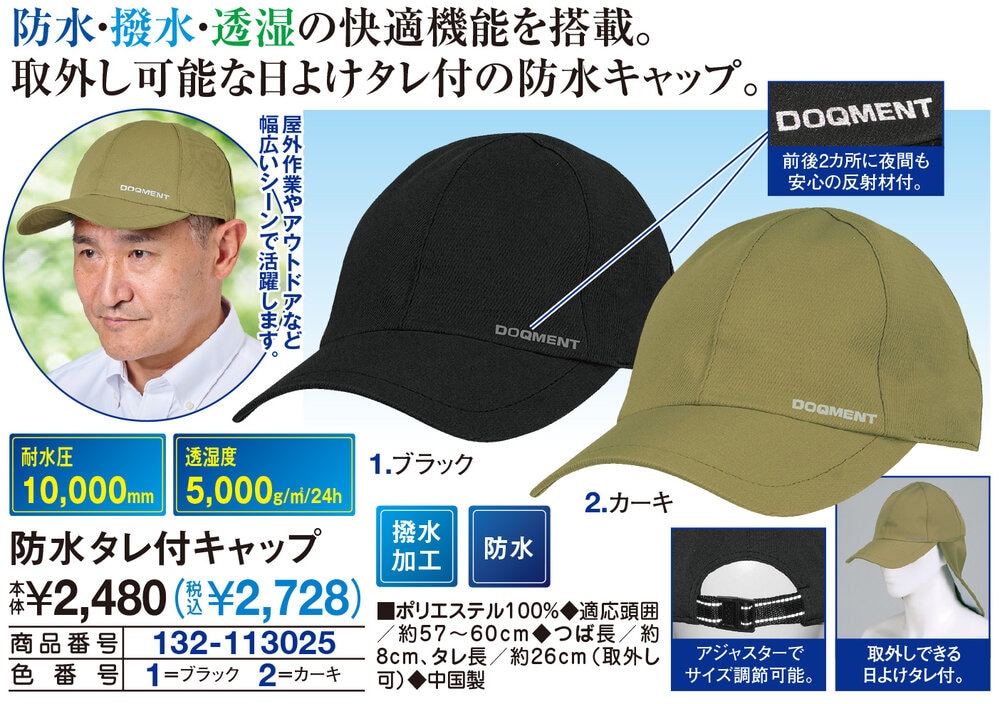 防水・撥水・透湿の快適機能を搭載。取外し可能な日よけタレ付の防水キャップ! 屋外作業やアウトドアなど幅広いシーンで活躍します。 前後2カ所に夜間も安心の反射材付。 取外しできる日よけタレ付。 アジャスターでサイズ調節可能。 ●耐水圧10000mm ●透湿度5000g/m2/24h ●撥水加工 ●防水