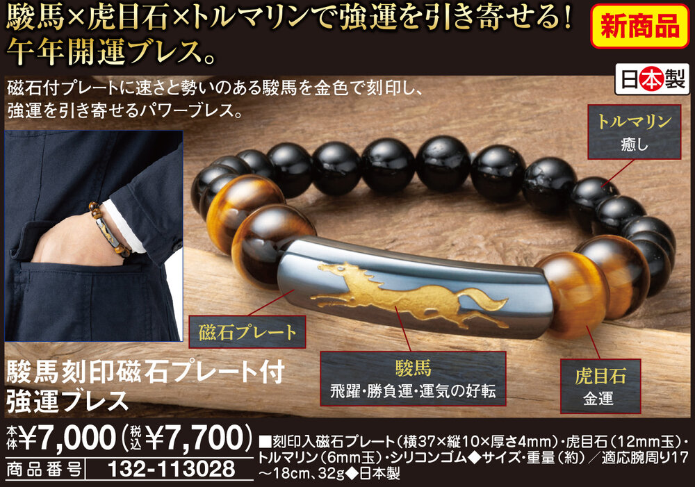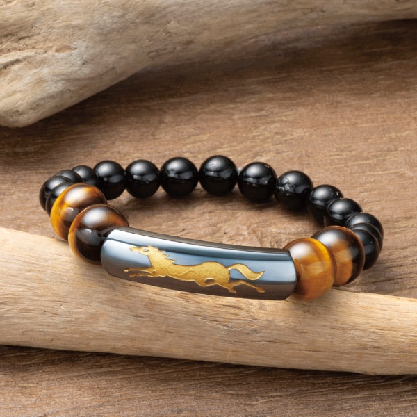 駿馬×虎目石×トルマリンで強運を引き寄せる!午年開運ブレス! 磁石付プレートに速さと勢いのある駿馬を金色で刻印し、強運を引き寄せるパワーブレス。 トルマリン:癒し 磁石プレート 駿馬:飛躍・勝負運・運気の好転 虎目石:金運