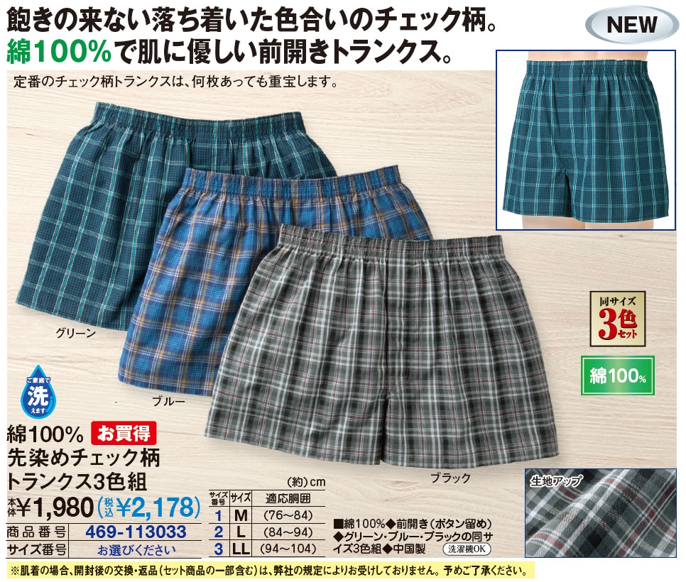飽きの来ない落ち着いた色合いのチェック柄。綿100%で肌に優しい前開きトランクス。