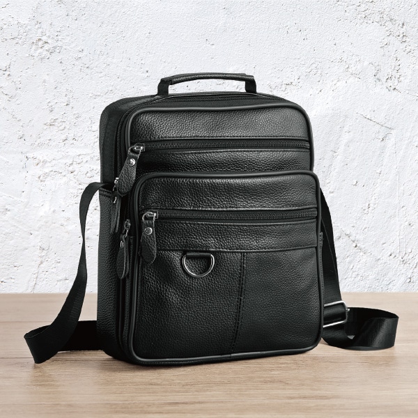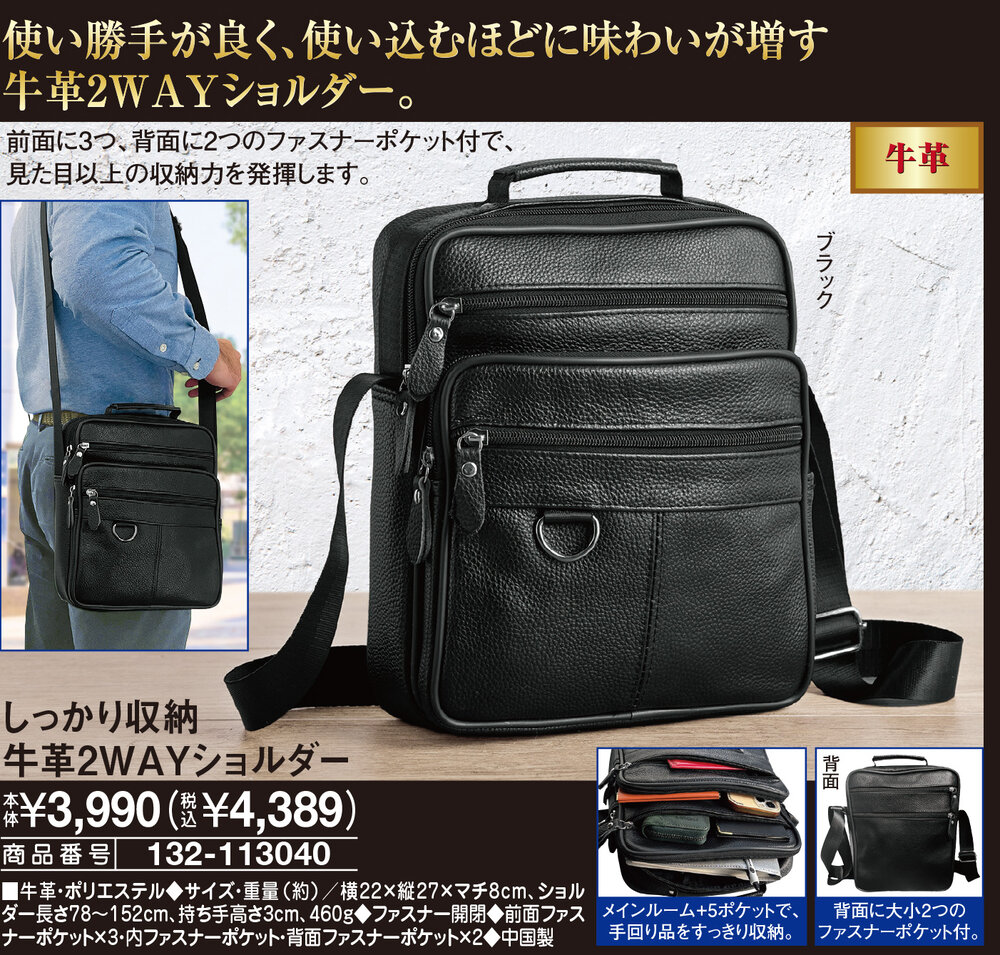 使い勝手が良く、使い込むほどに味わいが増す牛革2WAYショルダー! 前面に3つ、背面に2つのファスナーポケット付で、見た目以上の収納力を発揮します。 メインルーム+5ポケットで、手回り品をすっきり収納。 背面に大小2つのファスナーポケット付。 ●牛革
