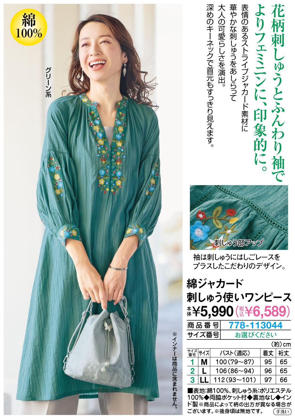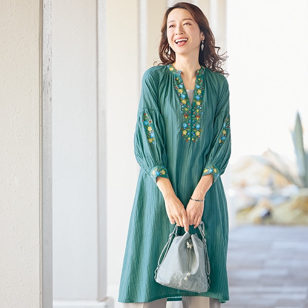 花柄刺しゅうとふんわり袖でよりフェミニンに、印象的に! 表情のあるストライプジャカード素材に華やかな刺しゅうをあしらって大人の可愛らしさを演出。 深めのキーネックで首元もすっきり見えます。 袖は刺しゅうにはしごレースをプラスしたこだわりのデザイン。 ●綿100%