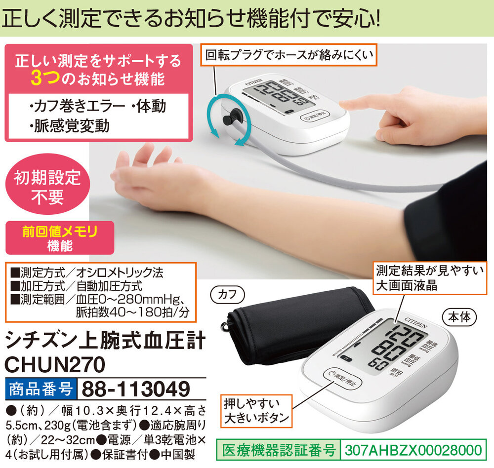 正しく測定できるお知らせ機能付で安心! 【正しい測定をサポートする3つのお知らせ機能】 ・カフ巻きエラー ・体動 ・脈感覚変動 回転プラグでホースが絡みにくい ●初期設定不要 ●前回値メモリ機能 ・測定結果が見やすい大画面液晶 ・押しやすい大きいボタン ◆医療機器認証番号:307AHBZX00028000 ■測定方式/オシロメトリック法 ■加圧方式/自動加圧方式 ■測定範囲/血圧0~280mmHg、脈拍数40~180拍/分