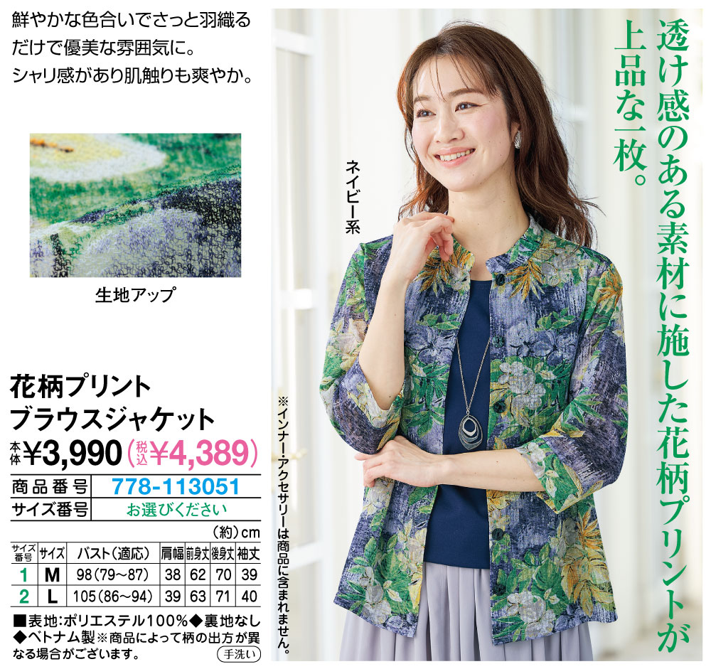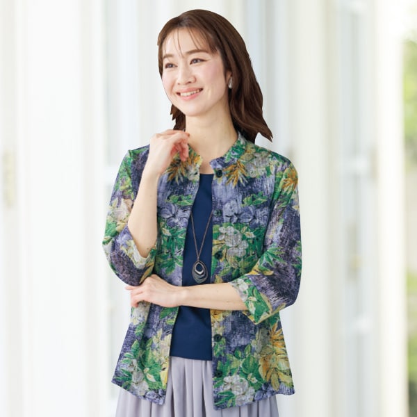 透け感のある素材に施した花柄プリントが上品な一枚! 鮮やかな色合いでさっと羽織るだけで優美な雰囲気に。シャリ感があり肌触りも爽やか。
