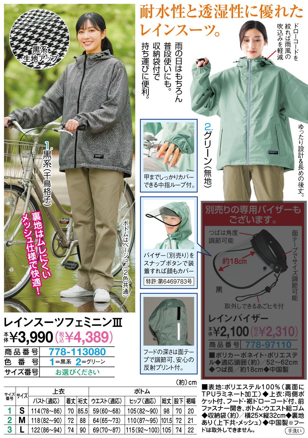 上衣【サイズ(約)】 バスト(適応)、着丈、裄丈 <S>114(78〜86)cm、70cm、85.5cm <M>118(82〜90)cm、72cm、88cm <L>122(86〜94)cm、74cm、90cm ボトム【サイズ(約)】 ウエスト(適応)、ヒップ(適応)、総丈、股下、裾幅 <S>59(60〜68)cm、105(82〜90)cm、98cm、70cm、20cm <M>64(65〜73)cm、110(87〜95)cm、101.5cm、72cm、21cm <L>69(70〜87)cm、115(92〜100)cm、105cm、74cm、22cm ■表地:ポリエステル100%(裏面にTPUラミネート加工) ◆上衣:両側ポケット付、フード・裾ドローコード付、前ファスナー開き、ボトム:ウエスト総ゴム ◆収納袋(約)/横25×縦32cm ◆裏地あり(上下共・メッシュ) ◆中国製