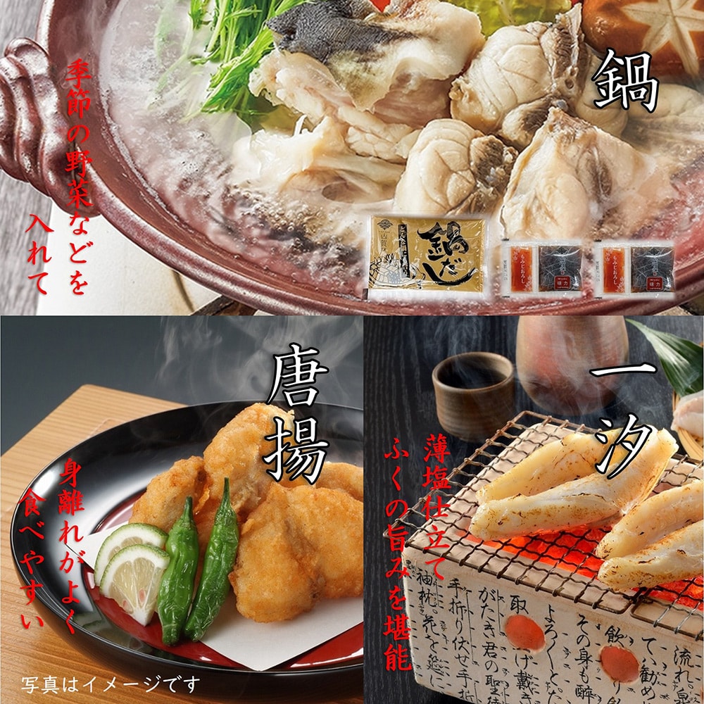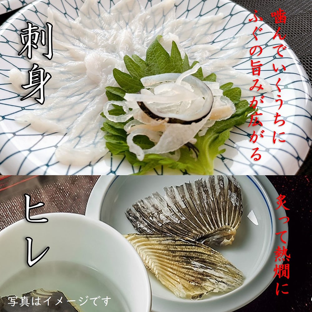●セット内容/トラフグ刺身20g、トラフグ皮刺し10g、マフグ切身350g(ちり250g、アラ100g)、マフグ唐揚げ150g、ゴマフグ一汐100g、トラフグ干しひれ3枚、鍋だし55g、ポン酢42g(14g×3個)、もみじおろし7.5g(2.5g×3) ●賞味期限/製造日から冷凍90日 ●加工地/日本 ●原材料/【トラフグ刺身】トラフグ(長崎県産他、養殖)【トラフグ皮刺し】トラフグ(国産)【マフグ切身】マフグ(新潟県産他)【マフグ唐揚げ】マフグ(国産)、衣(澱粉(とうもろこし(遺伝子組み換え不分別))、パン粉、コーン粉末、食塩、コショウ末、酵母エキス、パプリカ、ジンジャーパウダー、ぶどう糖、唐辛子、ガーリック末)、食塩/加工澱粉、pH調整剤、(一部に小麦を含む)【ゴマフグ一汐】ゴマフグ(国産)、食塩/pH調整剤【トラフグ干しひれ】トラフグ(国産)【鍋だし】しょうゆ(国内製造)、食塩、昆布エキス、かつおぶし/調味料(アミノ酸等)、甘味料(甘草)、(一部に大豆・小麦を含む)【ポン酢】醤油(国内製造)、砂糖、醸造酢、ゆず果汁、日向夏みかん果汁、昆布エキス、かつお節エキス、酵母エキス/調味料(アミノ酸等)、甘味料(甘草)、(一部に大豆・小麦を含む)【もみじおろし】大根(国産)、唐辛子/アルコール、酸味料、モナスカス色素、増粘剤(グァーガム)、香辛料抽出物 ●特定原材料等 /小麦・大豆
