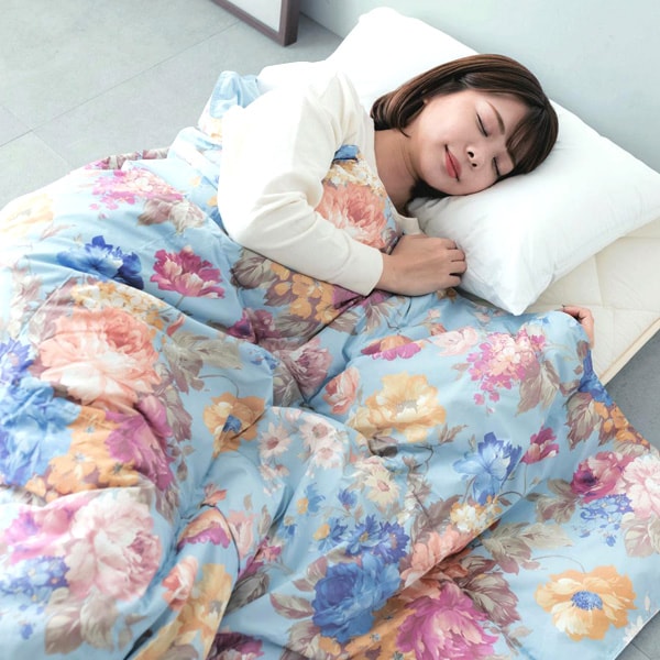 ●(約)/<シングル>150×210cm、詰め物250g、<ダブル>190×210cm、300g ●<側地>ポリエステル80%・綿20%、<詰め物>ホワイトダックダウン50%・フェザー50% ●中国製
