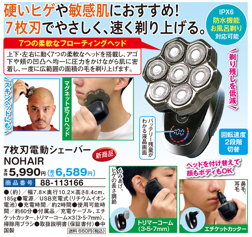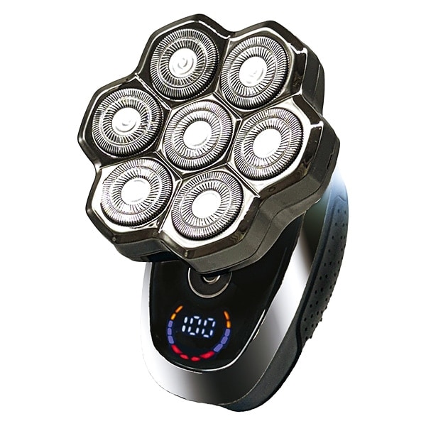 硬いヒゲや敏感肌におすすめ!7枚刃でやさしく、速く剃り上げる! 剃り残しを低減 ヘッドを付け替えて顔もボディもOK スキンヘッドにも ・回転速度2段階切替 ・バッテリー残量がわかる液晶画面 ・マグネット式7Dヘッド ・IPX6:防水機能お風呂剃り対応可能 【7つの柔軟なフローティングヘッド】 上下・左右に動く7つの柔軟なヘッドを搭載し、アゴ下や頬の凹凸へ均一に圧力をかけながら肌に密着し、一度に広範囲の面積の毛を剃り上げます。 ■エチケットカッター 鼻毛、耳毛 ■トリマーコーム(3・5・7mm) もみあげ、ヒゲの長さ調節