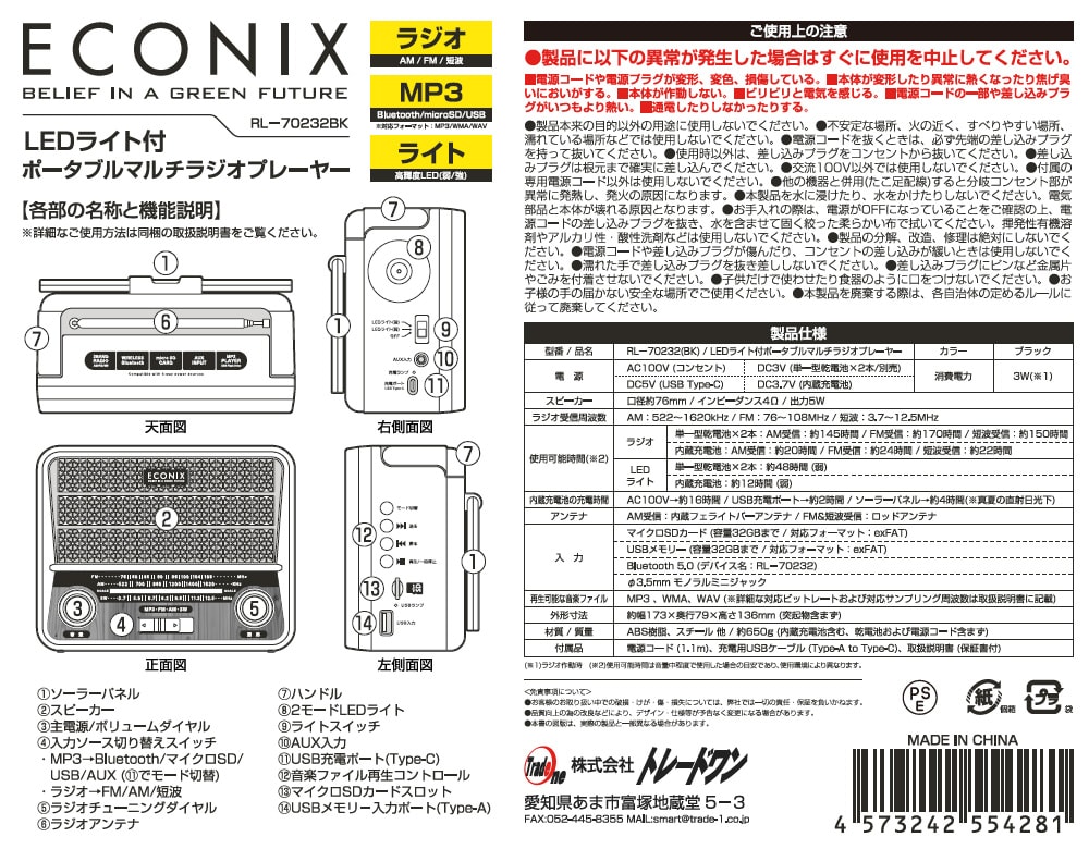【サイズ(約)】幅173×奥行79×高さ136mm、650g 【材質】ABS樹脂、スチール 他 【電源】AC100V(コンセント)、DC5V(USB Type-C)、DC3V(単一型乾電池×2本/別売)、DC3.7V(内蔵充電池) 【消費電力】3W 【ラジオ受信周波数】AM:522~1620kHz / FM:76~108MHz / 短波:3.7~12.5MHz 【内蔵充電池の充電時間】AV100V:約16時間、USB充電ポート:約2時間、ソーラーパネル:約4時間 【入力】マイクロSDカード、USBメモリー、Bluetooth5.0、φ3.5mmモノラルミニジャック 【再生可能な音楽ファイル】MP3、WMA、WAV 【付属品】電源コード(1.1m)、充電用USBケーブル(Type-A to Type-C)、取扱説明書(保証書付)