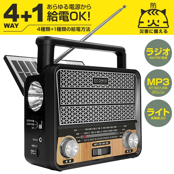 停電時や災害時にあると便利な1台3役のラジオプレーヤー! 給電方式は4WAY! ACコンセント・乾電池・ソーラーパネル・USBケーブル ◎高輝度LEDライト機能付き ◎AM/FM/短波ラジオ機能付き ◎Bluetooth/マイクロSD/USBの音楽再生(MP3)機能付き