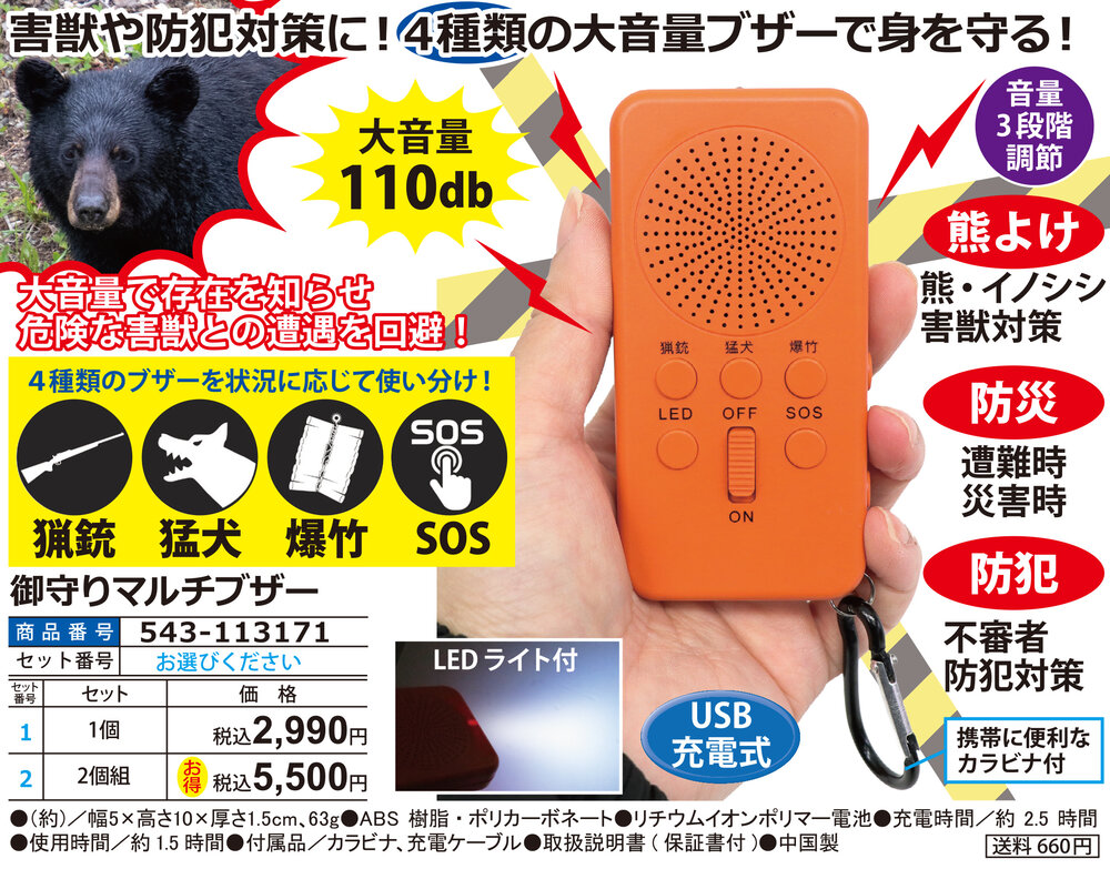 ●大音量で存在を知らせ危険な害獣との遭遇を回避! 【熊よけ】 熊・イノシシ害獣対策 【防災】 遭難時 災害時 【防犯】 不審者 防犯対策 ●携帯に便利なカラビナ付 ●USB充電式 ●音量3段階調節 ●LEDライト付